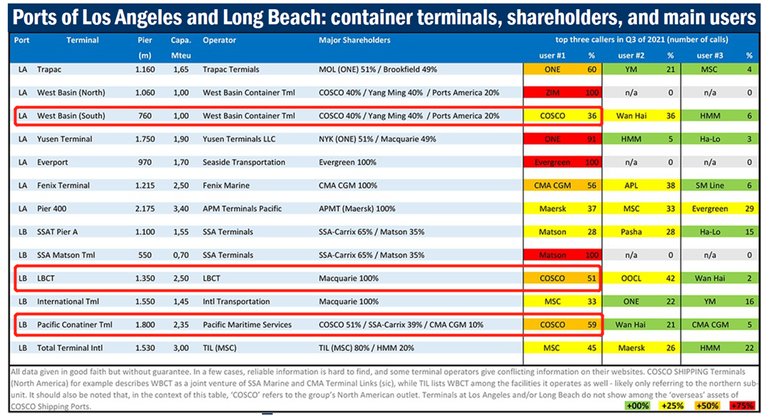 下兩圖是COSCO美西南航線碼頭分布。主要有三大碼頭: